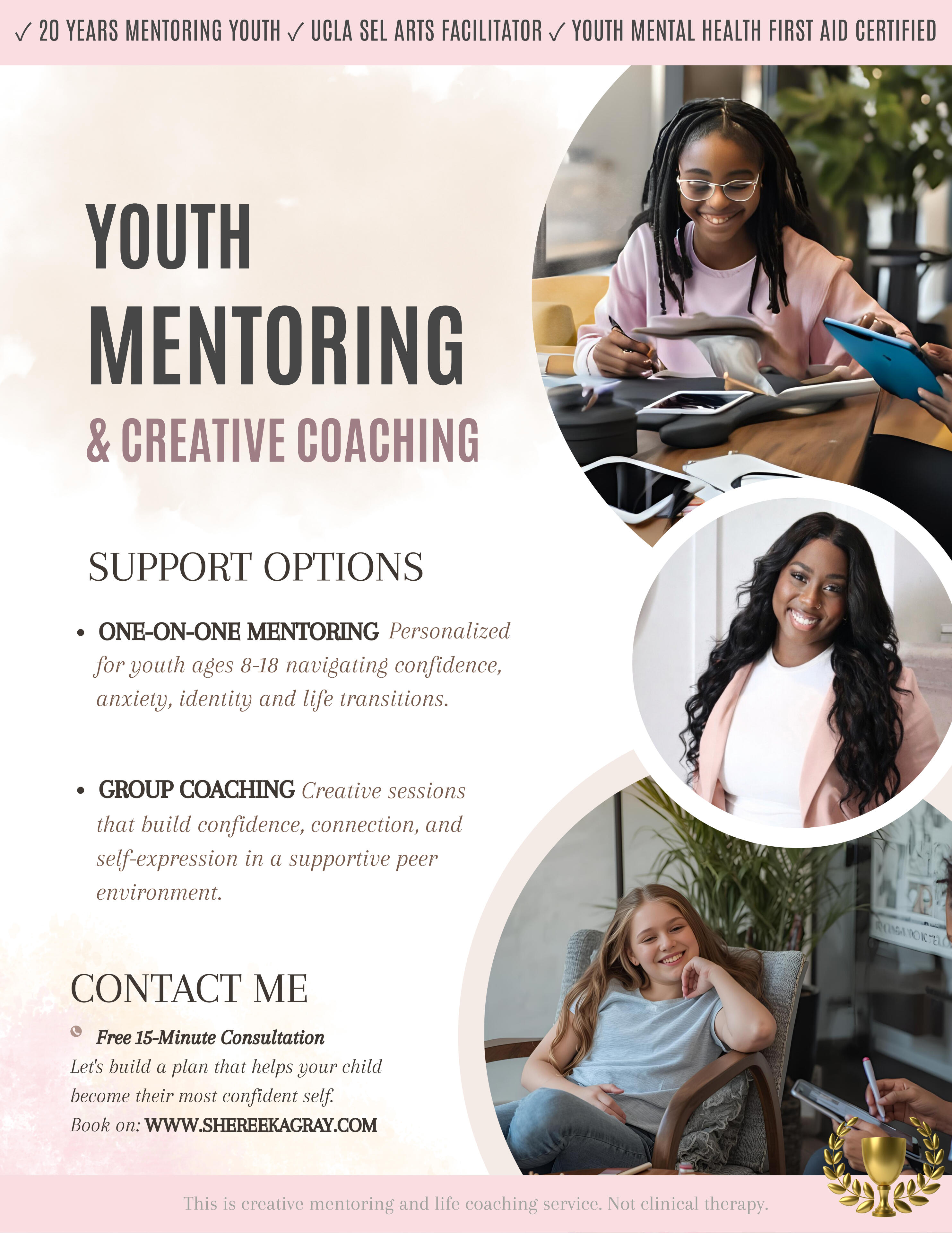 ✓Entrepreneurial mentoringFor schools, youth groups, and families looking for confidence-building mentorship for ages 8–18.
